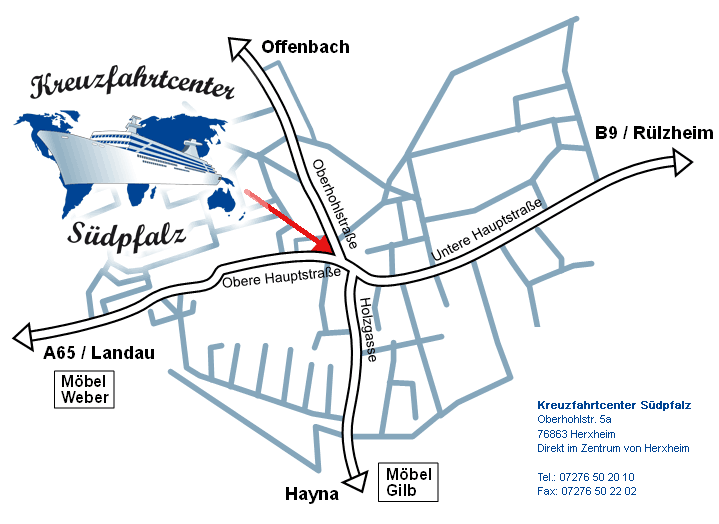 Kreuzfahrtcenter Südpfalz Oberhohlstr. 5a 76863 Herxheim Direkt im Zentrum von Herxheim info@kreuzfahrtcenter-suedpfalz.de Tel.: 07276 50 20 10 oder 0172 7534570 Fax: 07276 50 22 02